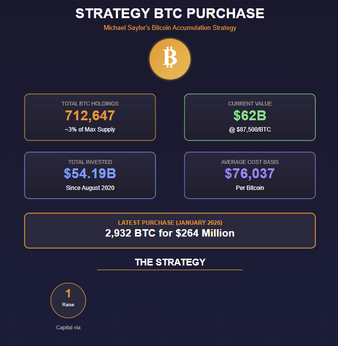 I recenti acquisti mostrano un modello. Dopo aver acquistato oltre 1 miliardo di dollari in BTC per due settimane consecutive all'inizio di gennaio (incluso un massiccio acquisto di 1,25 miliardi di dollari), la Strategia ha leggermente rallentato la scorsa settimana ma non si è mai fermata. L'azienda ha raccolto 264 milioni di dollari principalmente attraverso vendite di azioni ordinarie, con il 97% destinato direttamente a Bitcoin.