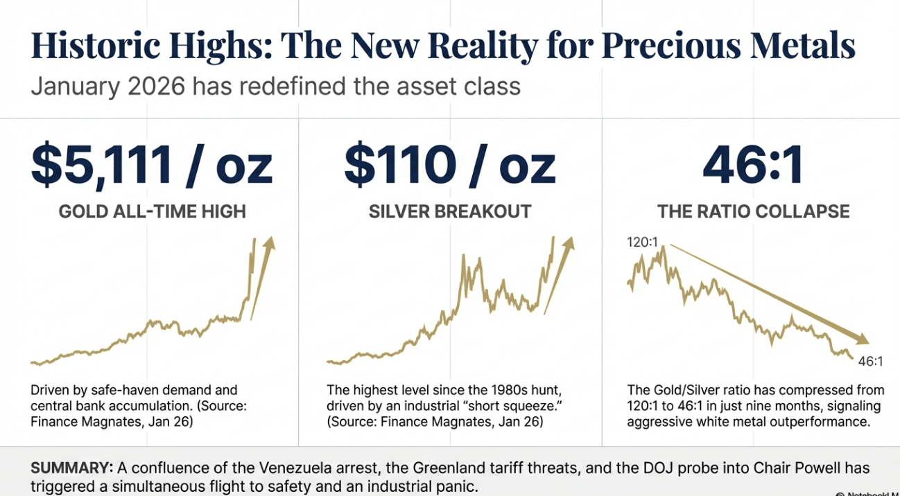 Il segnale più importante qui non è l'alto dell'oro o il livello dell'argento, è il rapporto Oro/Argento. Scendere da 120:1 a 46:1 ti dice che l'argento viene rivalutato come una propria tesi, non più solo un'ombra dell'oro. Quando il rapporto si muove così velocemente, di solito accadono due cose: il valore industriale dell'argento viene rivalutato e il flusso speculativo inizia a inseguire il reale stress dell'offerta.