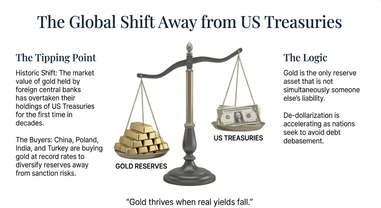 Questo è il segnale macro più pesante: le riserve auree superano i Treasury USA. Non significa che gli Stati Uniti collassano domani. Significa che il mondo sta diversificando il rischio. I Treasury sono una promessa di pagamento nel futuro. L'oro è un asset che non richiede che nessuno esegua. Quando le banche centrali aumentano l'allocazione all'oro, è una decisione di rischio sistemico. Queste tendono ad avere una lunga durata e sono difficili da invertire.
