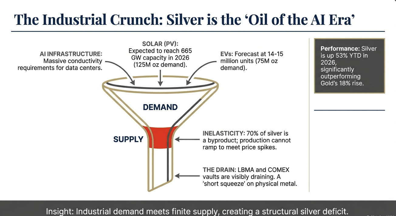 L'argento è il metallo dell'elettrificazione e dell'era dell'IA perché si trova in collegamenti critici e difficili da sostituire attraverso la conduttività, l'energia e l'hardware. Il collo di bottiglia è l'offerta: gran parte dell'argento è un sottoprodotto, quindi la produzione non può scalare rapidamente con il prezzo. Quando la domanda industriale aumenta costantemente mentre l'offerta risponde lentamente, i mercati prezzano in una “carenza persistente”. In quel regime, l'argento non si muove come un meme. Si muove come una merce strategica.