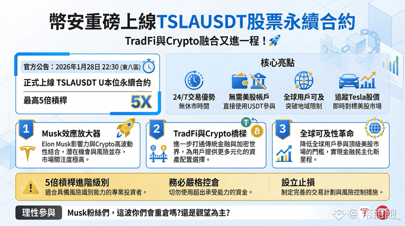 官方公告來了:2026年1月28日22:30(東八區)正式上線TSLAUSDT U本位永續合約,最高5倍槓桿,追蹤Tesla Inc. (Nasdaq: TSLA)普通股價格。