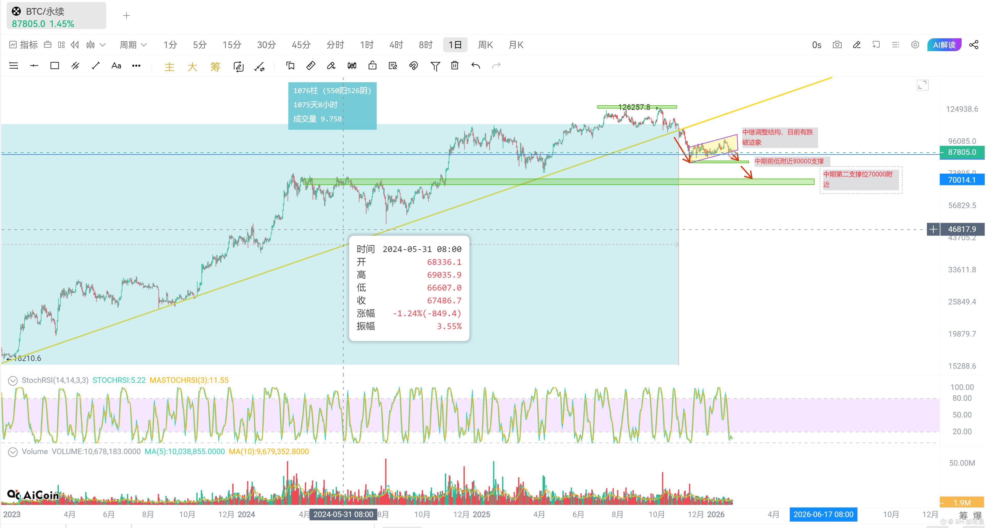 大饼目前报价88300左右,昨日我们帖子讲到周线收线裸K形成看跌吞没,还有跌破中继结构,中期看跌到下方新低80000位置,以及下方第二支撑位为70000_72000左右。