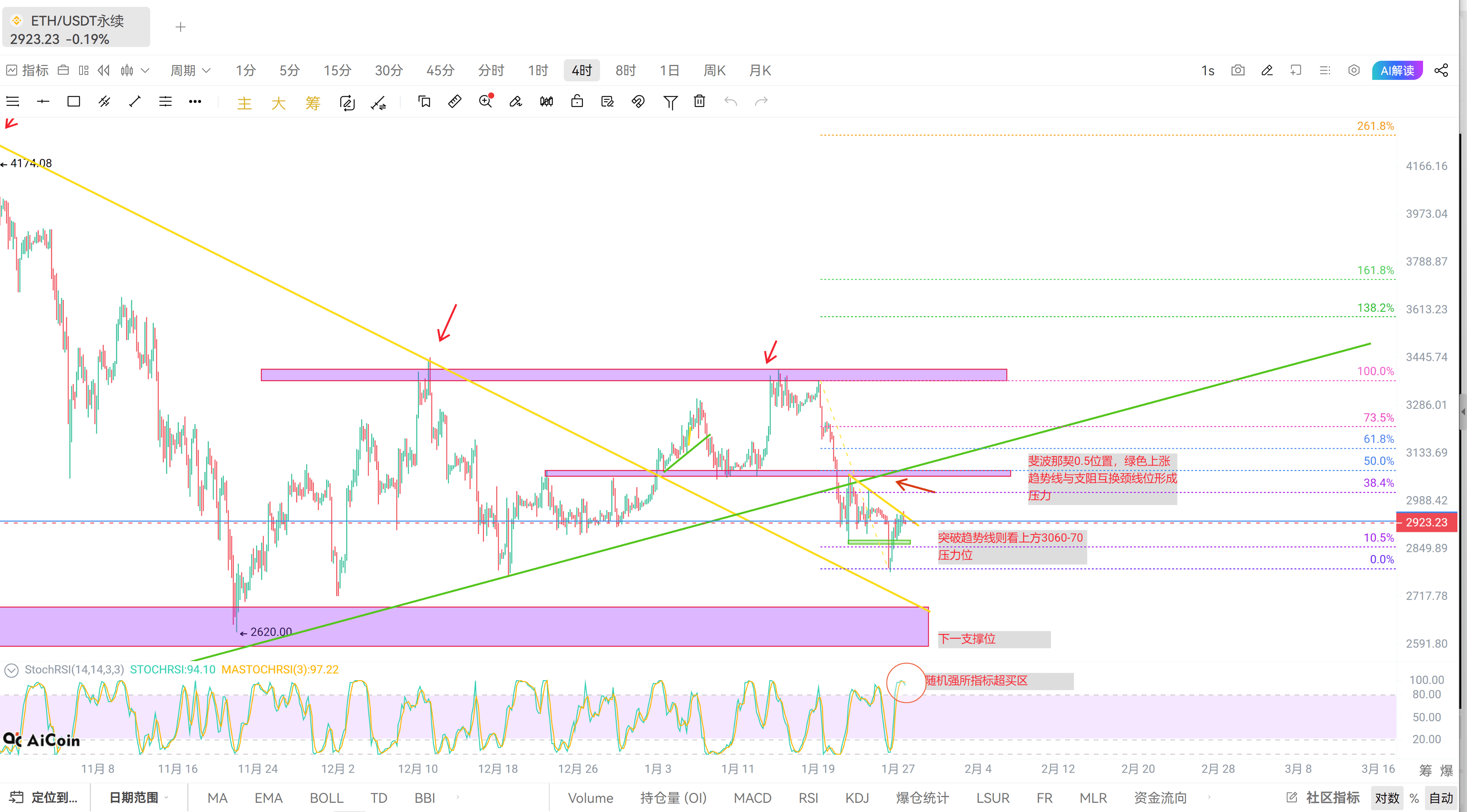 以太坊看图,四小时级别看,下方随机强弱指标在上方超买区,有回调风险,还有目前黄色下跌趋势线压制,中期跟随大饼节奏也是看跌新低,2600附近,假如突破2980则上方压力位为0.382附近3020和上方斐波那契0.5,绿色上涨趋势线,蓝色颈线位位置3070附近。