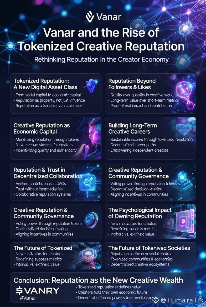 From my perspective, this is where Vanar becomes extremely interesting. Instead of treating reputation as something external and platform owned, Vanar opens the possibility for creators to turn their reputation into a tokenized digital asset that they actually control, making $VANRY and @Vanar part of a much deeper shift in how creative value is stored and recognized.