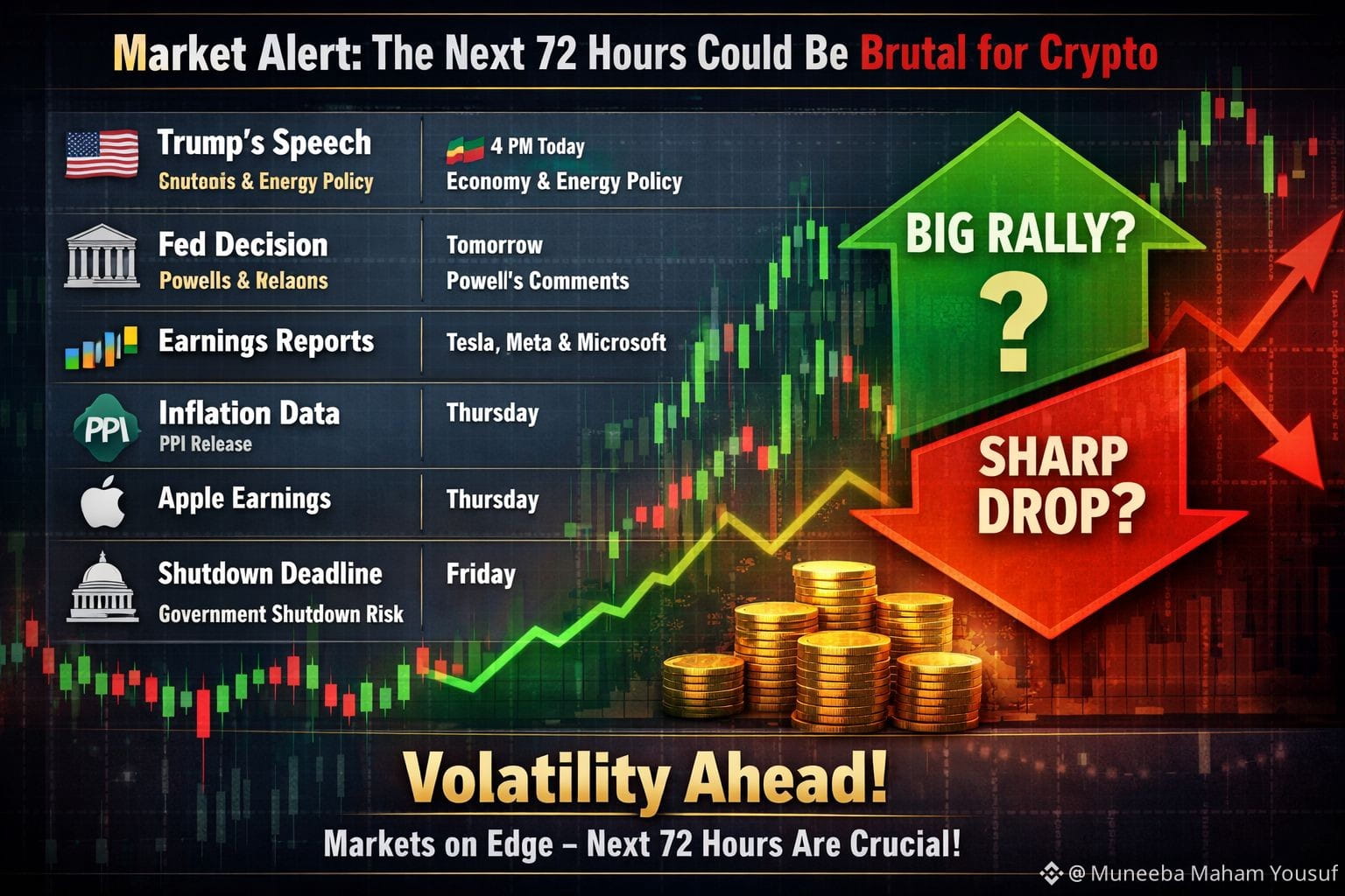 The coming three days may be some of the most volatile we’ve seen in crypto and global markets in months. Several heavyweight macro events are colliding at once, and when that happens, even a small shock can trigger a sharp market reaction. Big moves feel almost unavoidable — the only uncertainty is whether they’ll be up or down.