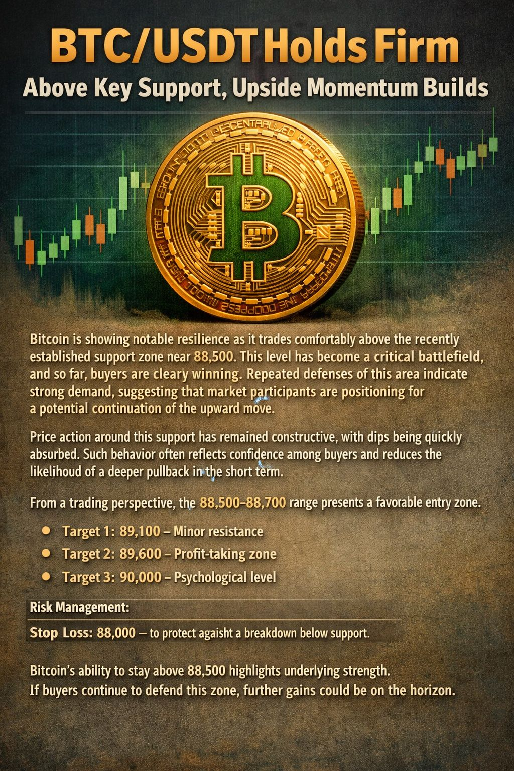 $BTC /USDT mostra forza sopra il recente supporto attorno a 88,500. Gli acquirenti stanno difendendo questa zona, suggerendo una potenziale continuazione al rialzo.