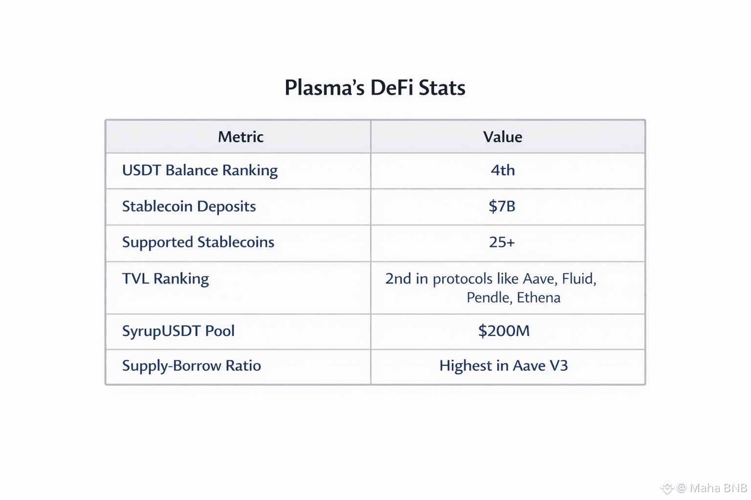 DeFi protocols love Plasma because it’s built for stablecoins. Aave V3 markets on Plasma have the world’s highest supply-to-borrow ratio for stablecoins. Plasma also ranks second in TVL across big protocols like Aave, Fluid, Pendle, and Ethena. The syrupUSDT pool alone has $200 million, making onchain liquidity hard to beat.