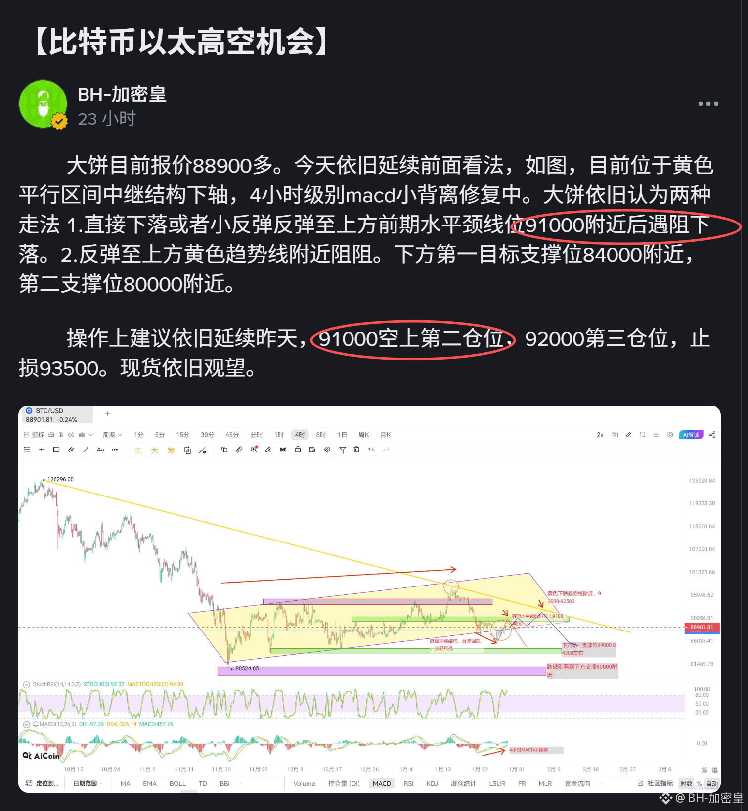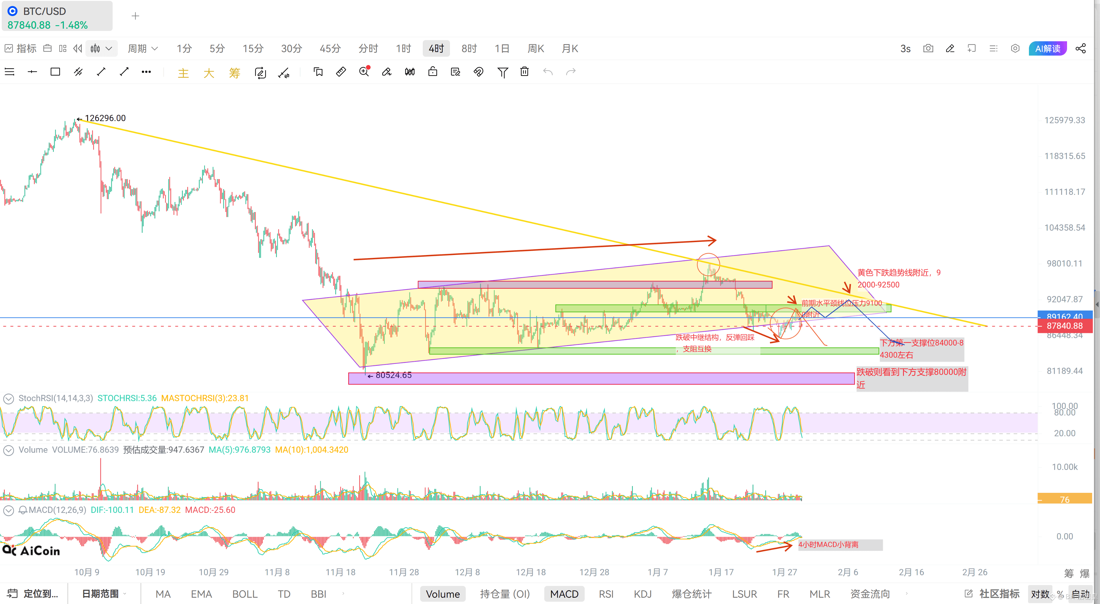 目前我们再来看依旧是下图,各阶段支撑阻力位都标明了,目前又跌落黄色平行区间中继结构下轴趋势线,我们向下第一目标依旧看84000附近,还有再向下80000附近位置。