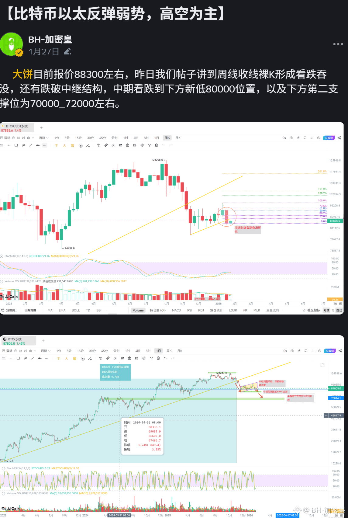 大饼目前报价88000左右。近日我们帖子不断提醒,大盘高空为主,不要被诱多,下跌趋势还没有改变,并画出精准走势,还有给到了比较精准的做空点位,跟上的伙伴相信已经吃肉了,新来的伙伴可以翻看前面帖子。