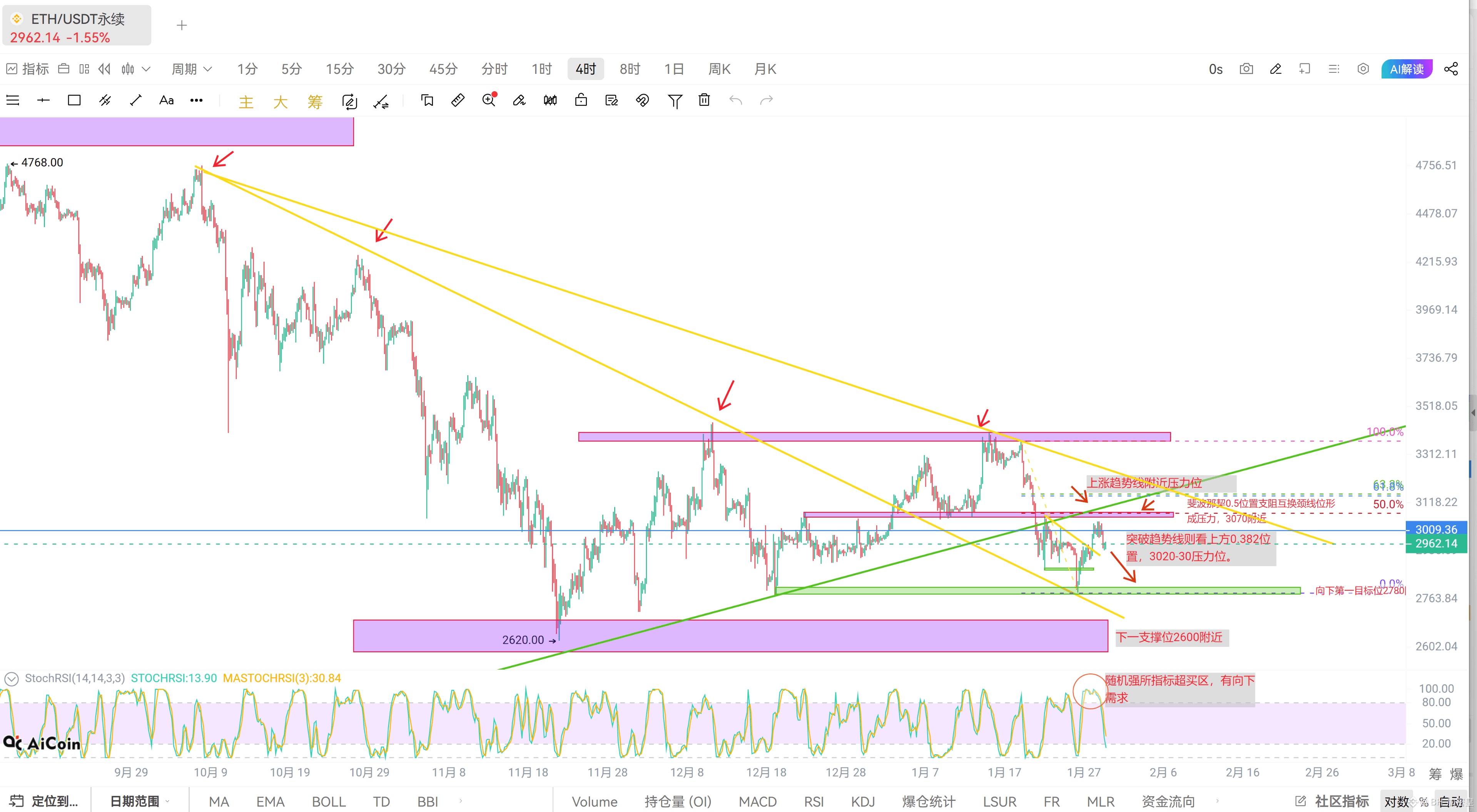 以太坊操作上建议,跟上空单的伙伴第一目标位2780附近止盈一半,2600附近止盈全部。 现货依旧等待机会。