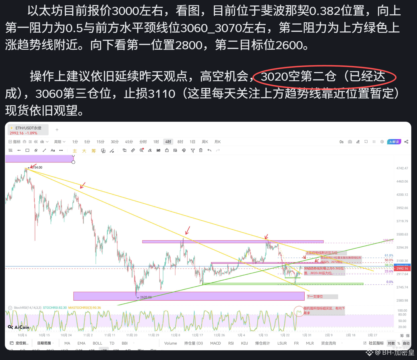 以太坊我们再来看,这两天也是给到精准点位和走势预判,看下:第二仓位3020,和第三仓位3060附近,昨晚也基本达到。