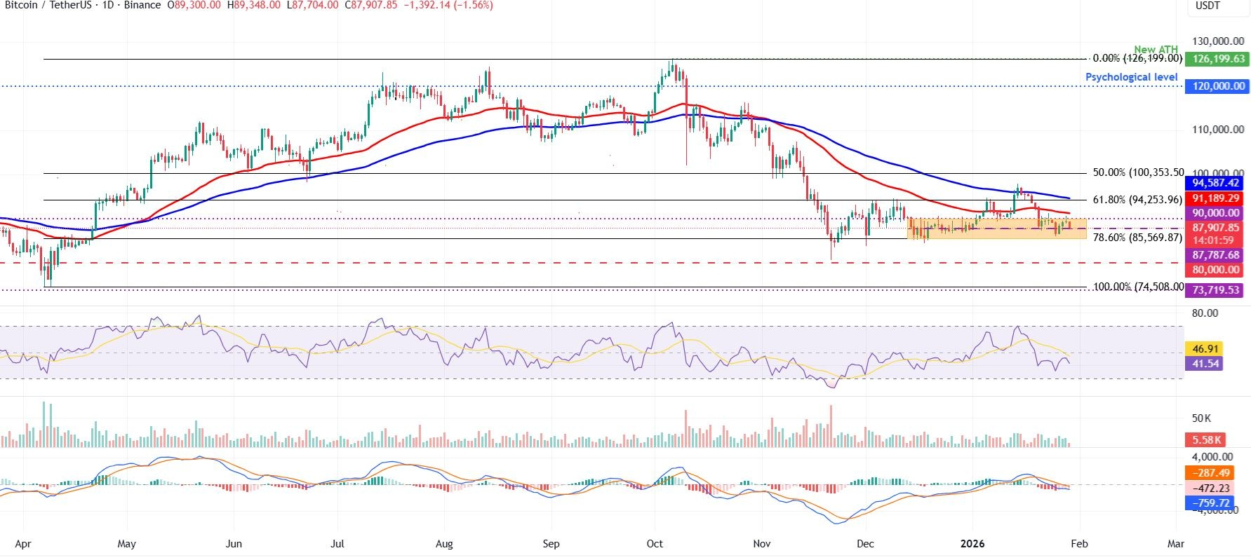 Resistenza al rimbalzo: se il supporto di 87,787 dollari è valido, il Bitcoin potrebbe continuare a salire, mirando al limite superiore di 90,000 dollari, ulteriori rotture potrebbero puntare alla EMA a 50 giorni di 91,189 dollari.
