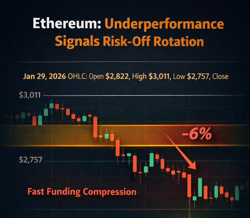 Ethereum ha sottoperformato Bitcoin durante la sessione. $ETH ha registrato un massimo giornaliero vicino a $3,010 e è sceso a ~$2,757, un calo di circa il 6% intraday.