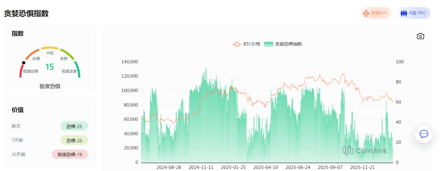 恐慌贪婪指数已跌至 15(极度恐慌)