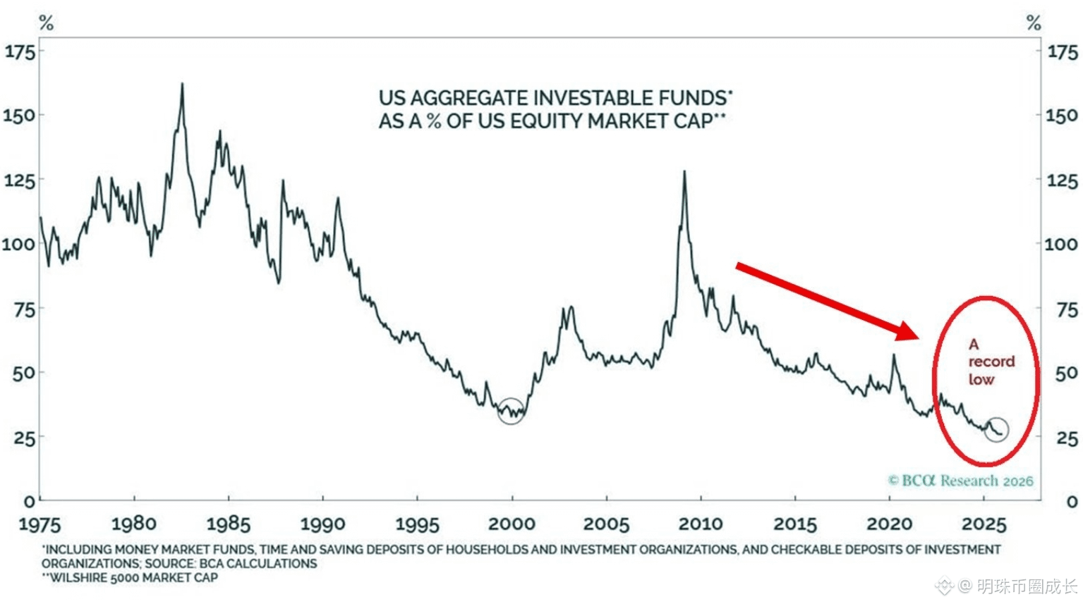 全球基金经理现金配置比例已到历史极低水平(约 3.2%),市场处于“仓位打满、现金枯竭”的状态;