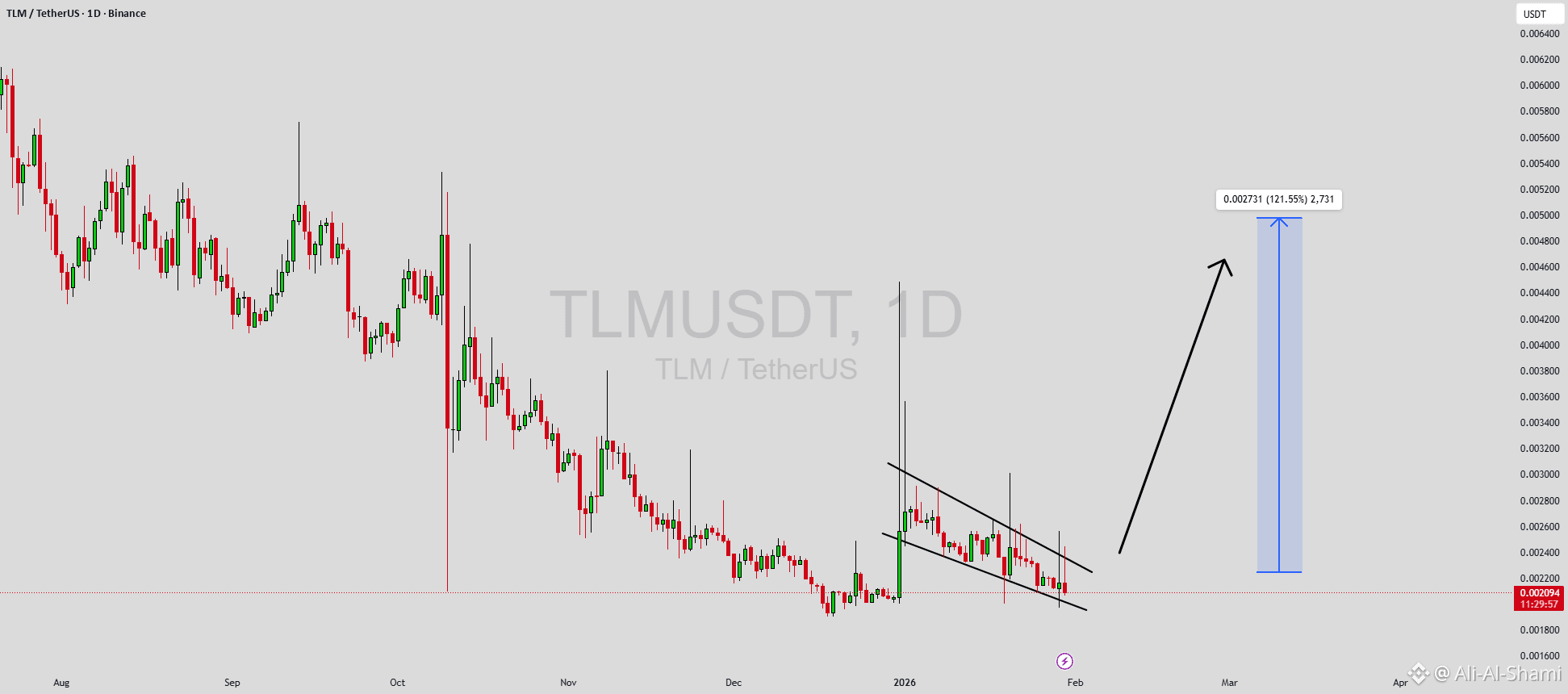 TLMUSDT يشكل نمط وتد هابط واضح، وهو إشارة تقلب صعودية كلاسيكية تشير غالبًا إلى اختراق قادم. لقد كانت الأسعار تتماسك ضمن نطاق ضيق، مما يشير إلى أن ضغط البيع يضعف بينما يبدأ المشترون في استعادة السيطرة. مع تأكيد الحجم المتسق على التراكم عند مستويات أدنى، يشير الإعداد إلى اختراق صعودي محتمل قريبًا. قد يؤدي التحرك المتوقع إلى مكسب مثير للإعجاب يبلغ حوالي 90% إلى 100% بمجرد أن تتجاوز الأسعار مقاومة الوتر.
