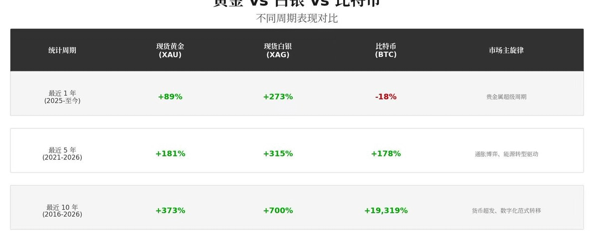 1️⃣ Comprendere la posizione di ciascun asset e chiarire l'obiettivo di allocazione. L'oro e l'argento continuano a mostrare una forte “capacità di copertura” durante periodi di incertezza macroeconomica, adatti per un'allocazione difensiva; il Bitcoin è attualmente più adatto per un aumento della posizione in periodi di maggiore propensione al rischio e logiche di crescita tecnologica, ma attenzione a non scommettere sull'oro per diventare ricchi in una notte. Vuoi combattere l'inflazione e proteggerti → compra oro; vuoi rendimenti elevati a lungo termine → compra Bitcoin (ma preparati a subire un ritracciamento del -70%).