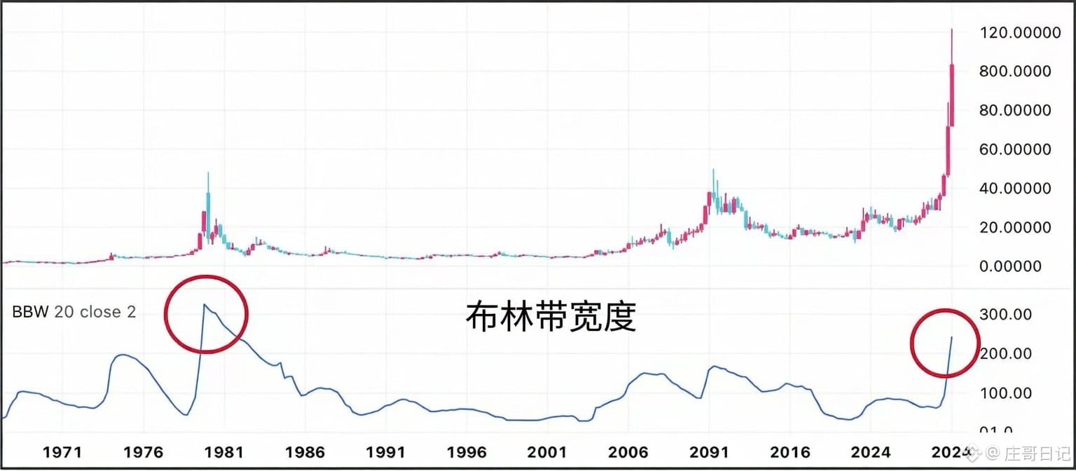 白银目前的波动率水平,布林带宽度,是自1980年代以来最高!