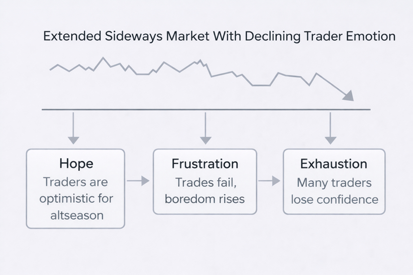 Dopo mesi di attesa, qualcosa di strano accade alle persone. Smettono di sentirsi entusiaste delle opportunità. Anche le buone notizie sembrano pesanti. Un grafico può rompere la struttura eppure nessuno vuole toccarlo. Non è perché le persone si sbagliano. È perché l'energia emotiva è già spesa.
