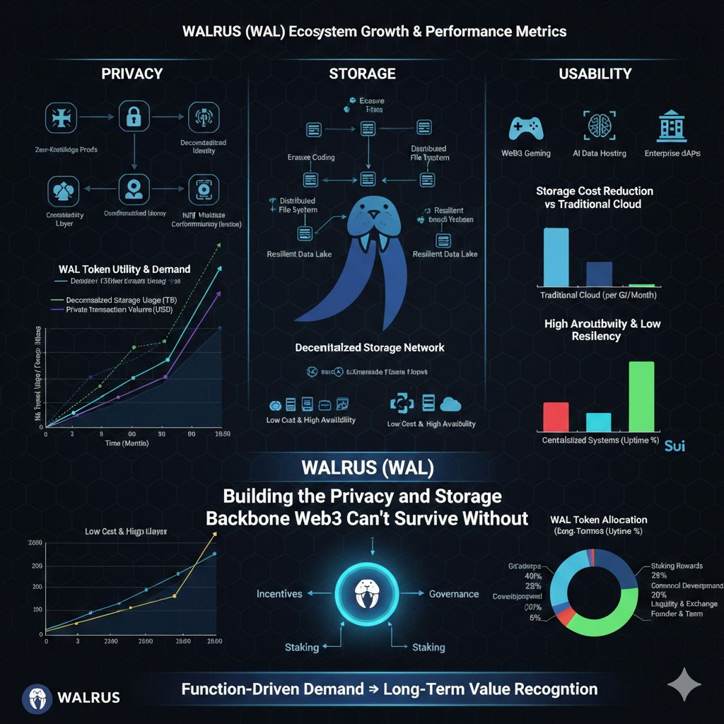 Il token WAL collega l'intero ecosistema fungendo da motore dietro incentivi, governance e staking. Allinea gli interessi di utenti, validatori e sviluppatori, creando un ciclo economico sostenibile piuttosto che un modello di ricompensa a breve termine. Man mano che più applicazioni si affidano a Walrus per lo storage sicuro e interazioni private, l'utilità di WAL cresce insieme all'effettivo utilizzo della rete. Questo tipo di domanda guidata dalla funzionalità, non dall'hype, è ciò che spesso porta a un riconoscimento più forte a lungo termine.