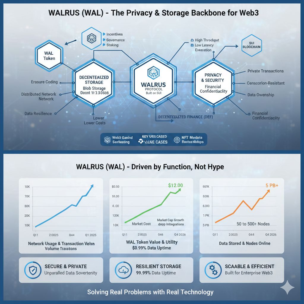 Walrus (WAL) sta emergendo in un momento in cui il mercato delle criptovalute non è più impressionato solo dal rumore e sta iniziando a premiare i progetti che risolvono problemi reali con tecnologie reali. Costruito sulla blockchain Sui, Walrus si posiziona come un pezzo serio di infrastruttura decentralizzata piuttosto che come un altro esperimento DeFi. Il suo focus su interazioni sicure, private e resistenti alla censura gli conferisce una rilevanza immediata in un mondo in cui la proprietà dei dati e la privacy finanziaria stanno diventando preoccupazioni quotidiane, non idee astratte.