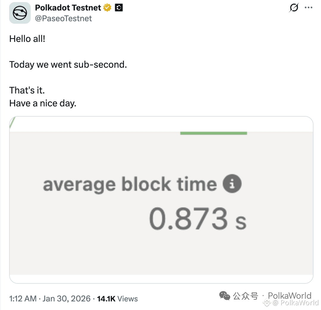 这意味着什么?意味着 Polkadot 的测试网,已经正式进入亚秒级出块阶段。