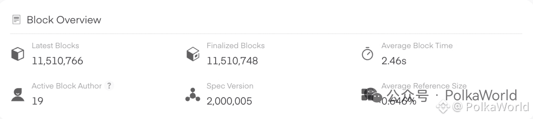 与此同时,Polkadot Hub 也从原本的 6 秒出块,切换到 2 秒出块(目前显示平均出块时间在 2.46 秒)。