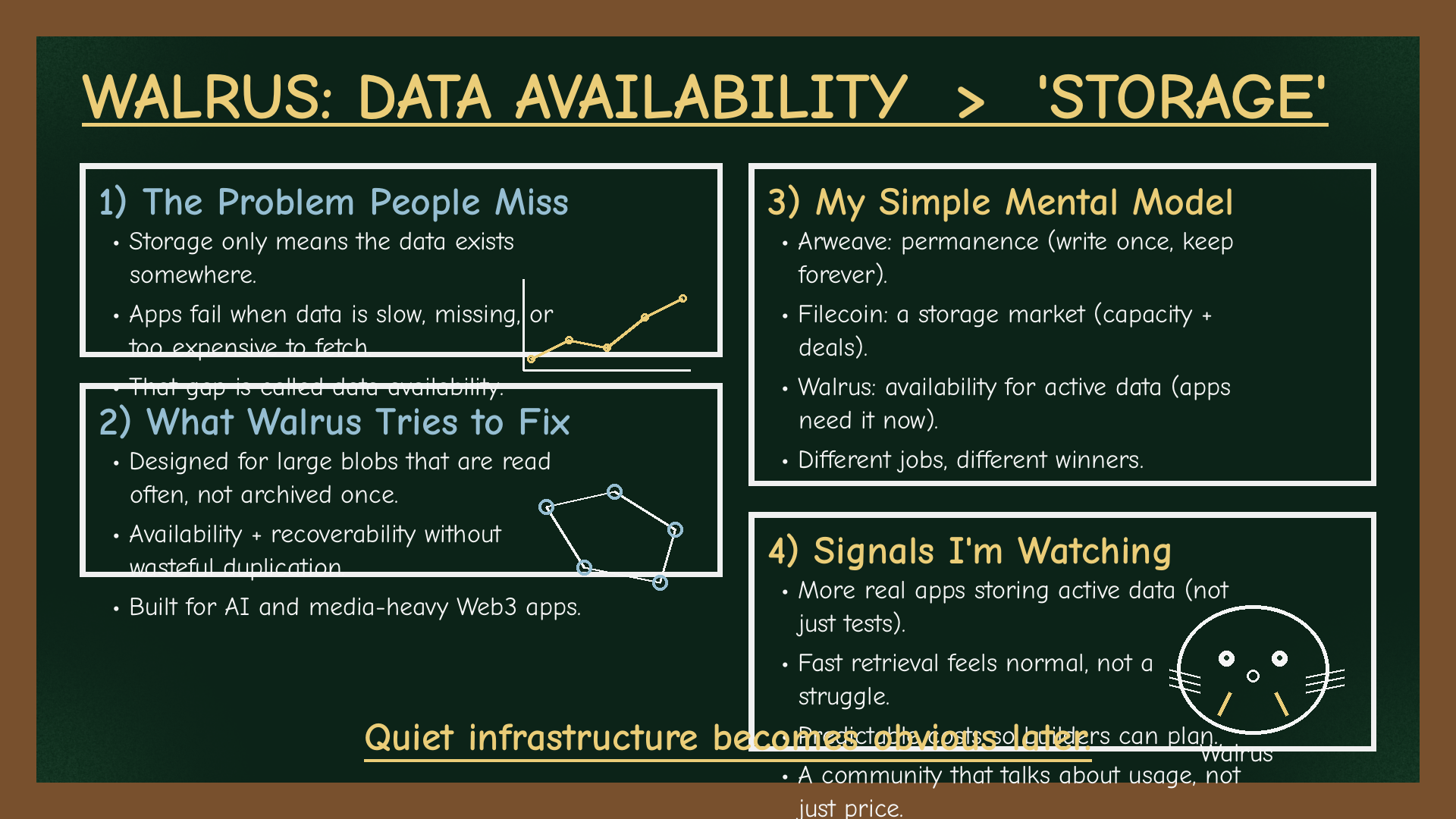 Alla fine, si riduce a quanto lontano vogliamo spingere la decentralizzazione. Vogliamo un futuro che copra veramente tutti i livelli dello stack, o siamo contenti di misure parziali? Io propendo per la prima opzione. Walrus non riguarda solo l'archiviazione dei file; allude al prossimo capitolo di Web3 – uno in cui i dati sono decentralizzati e potenzianti come il nostro denaro. Potrebbe non innescare un rally dei prezzi domani, ma tra qualche anno questo tipo di infrastruttura potrebbe essere alla base della prossima ondata di app killer. La promessa è che i creatori non dovranno scegliere tra velocità, sicurezza, costo e decentralizzazione – possono avere tutto.