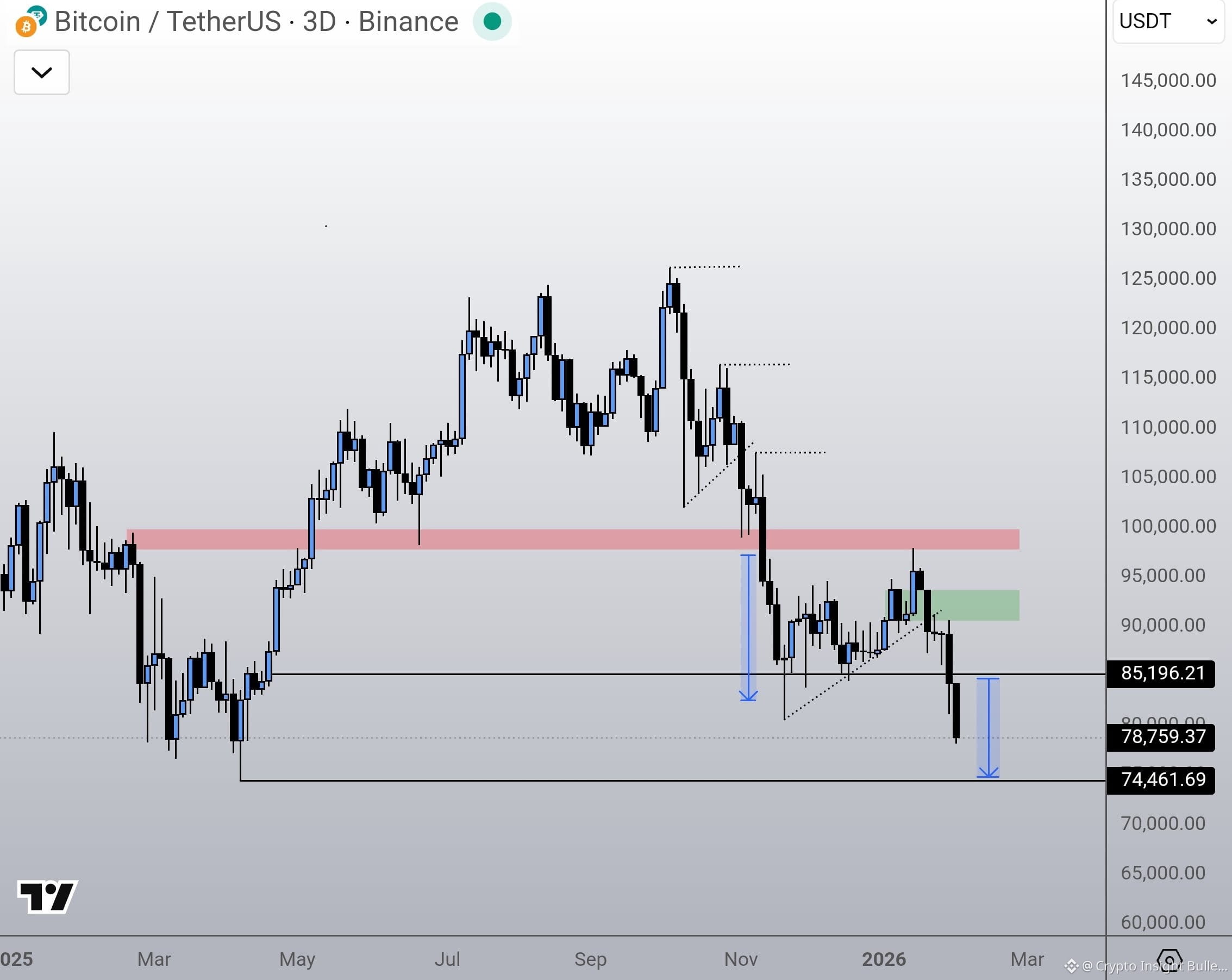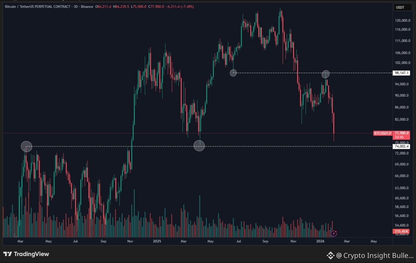 Critical Areas Lost: We just lost the $84k area, then the 82k area and the last area was the 80k area. The second critical assistance on the daily chart is only approximately, about 74,000 to 75,000 of the April, 2025 panic.