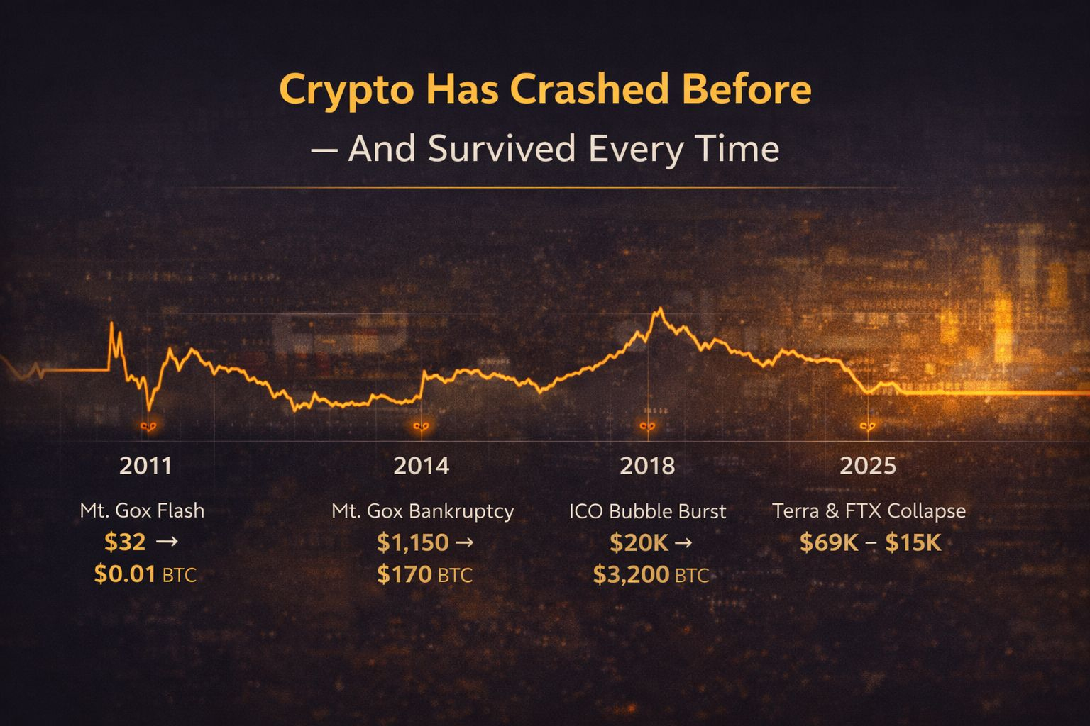 If you're checking your portfolio this morning (February 01, 2026), and BTC is dipping with all the U.S. shutdown mess, Fed rumors. Markets like this can make anyone second-guess everything. But let's pause the panic for a minute. Crypto has been through hell before, and it's come out stronger every time. No one knows if we'll see another big crash in 2026, markets are unpredictable, and things could bounce back tomorrow. But just in case things get rougher, history has some solid lessons.