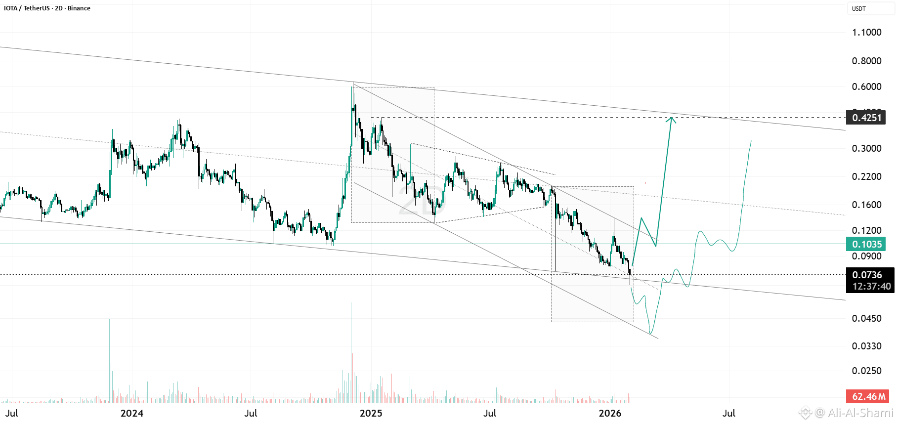 IOTA تتداول حالياً عند منطقة دعم طويلة الأجل حاسمة بعد انخفاض مطول ضمن هيكل تنازلي. السعر يحتفظ بالقرب من الحد الأدنى للقناة، وهي منطقة كانت تعمل سابقاً كطلب قوي.