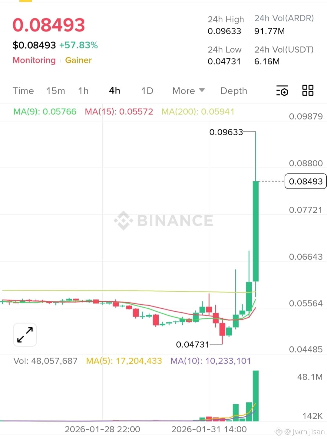 $ARDR just printed a vertical move, jumping over +50% in a very short time, and this pump is the result of structure + liquidity aligning, not pure hype. On the higher timeframe, ARDR spent a long period ranging and compressing between the 0.047–0.055 zone, forming a clear accumulation base where weak hands exited and stronger participants quietly built positions. Once price reclaimed the 0.060 level, it triggered a chain reaction: multiple moving averages (MA9, MA15, MA200 on 4H) were flipped into support, volume expanded aggressively, and short sellers were forced to cover. The volume spike confirms this was demand-driven rather than a low-liquidity wick. When price breaks a multi-week range with strong volume, liquidity above resistance becomes a magnet, which explains the fast extension toward the 0.096 area. This kind of impulsive candle usually signals a regime shift from consolidation to expansion, meaning ARDR is no longer in a passive phase.