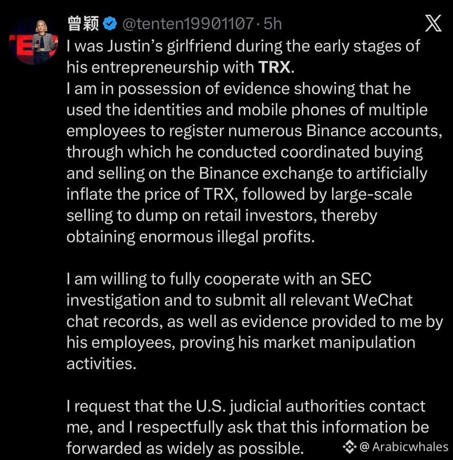 ادعاءات زينغ يينغ تربط جاستن صن بالتلاعب المبكر بـ TRX 🚨