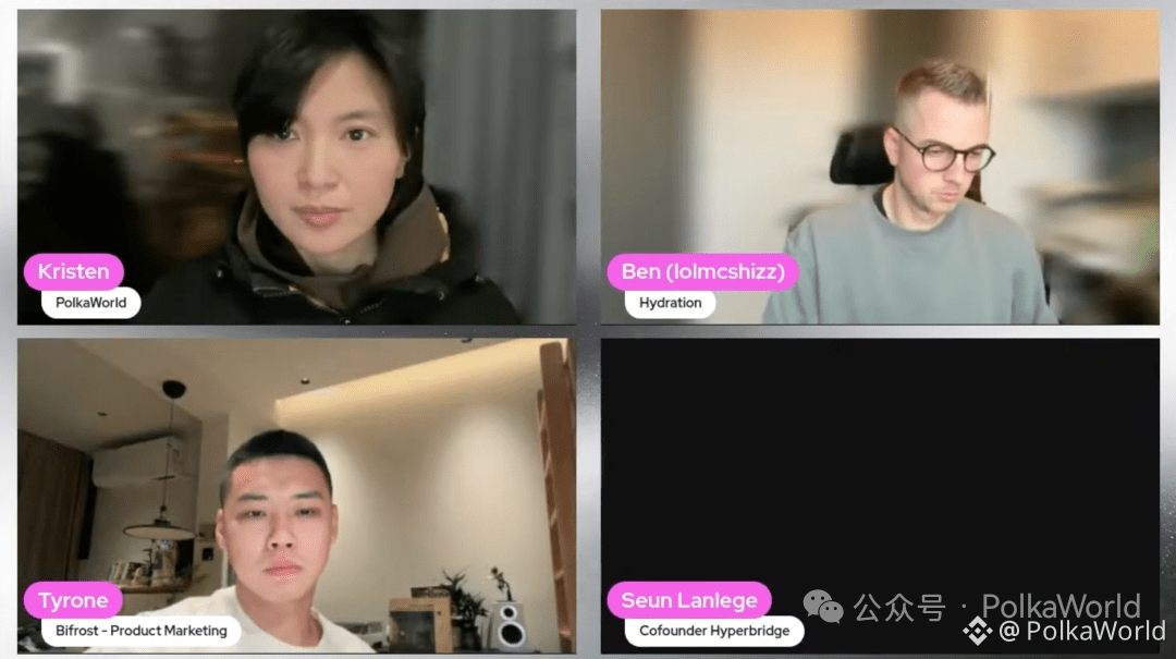 今天和我们一起参与讨论的,是三位长期深耕生态的项目代表:Hydration 的 Ben、Bifrost 的 Tyrone,以及 Hyperbridge 的 Sean。欢迎你们。
