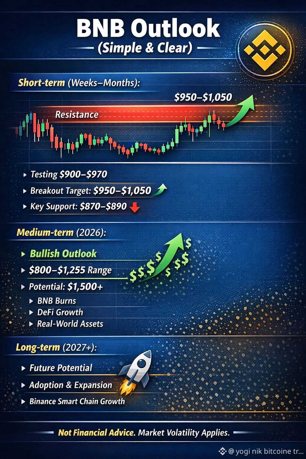 Market outlook remains bullish. Analysts expect BNB to trade in the $800–$1,255 range, with upside potential toward $1,500+ if market sentiment improves. Regular BNB burns, growing DeFi use, and real-world asset adoption could act as strong catalysts.