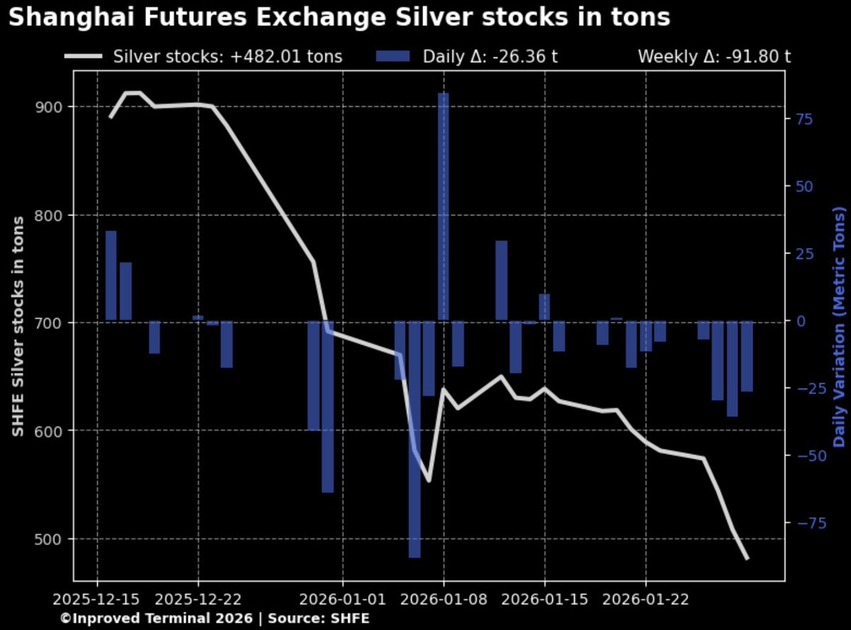 Prima di tutto, un po' sulla SHFE. È una delle più grandi borse merci del mondo, dove le persone comprano e vendono futures per metalli come argento, oro, rame e altro. Gestiscono anche prodotti energetici e agricoli. Per quanto riguarda l'argento, questi contratti si regolano effettivamente in metallo reale quindici chilogrammi per contratto, fisicamente consegnato da magazzini approvati dalla SHFE in tutta la Cina. L'argento presente in questi magazzini, chiamati scorte registrate o di garanzia, rappresenta ciò che è effettivamente disponibile per la consegna. La borsa aggiorna questi numeri ogni giorno, rendendoli una sorta di battito cardiaco per il mercato.