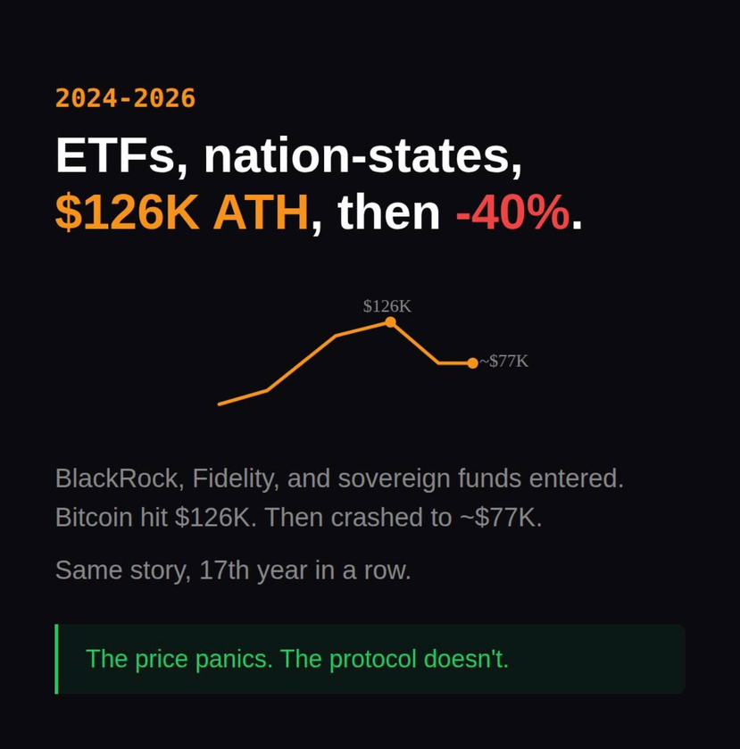 Questa è la parte che la maggior parte delle persone perde. Guardano il panico dei prezzi e pensano che Bitcoin stia entrando in panico. Non è così. A Bitcoin non importa. Continua a fare le sue cose.