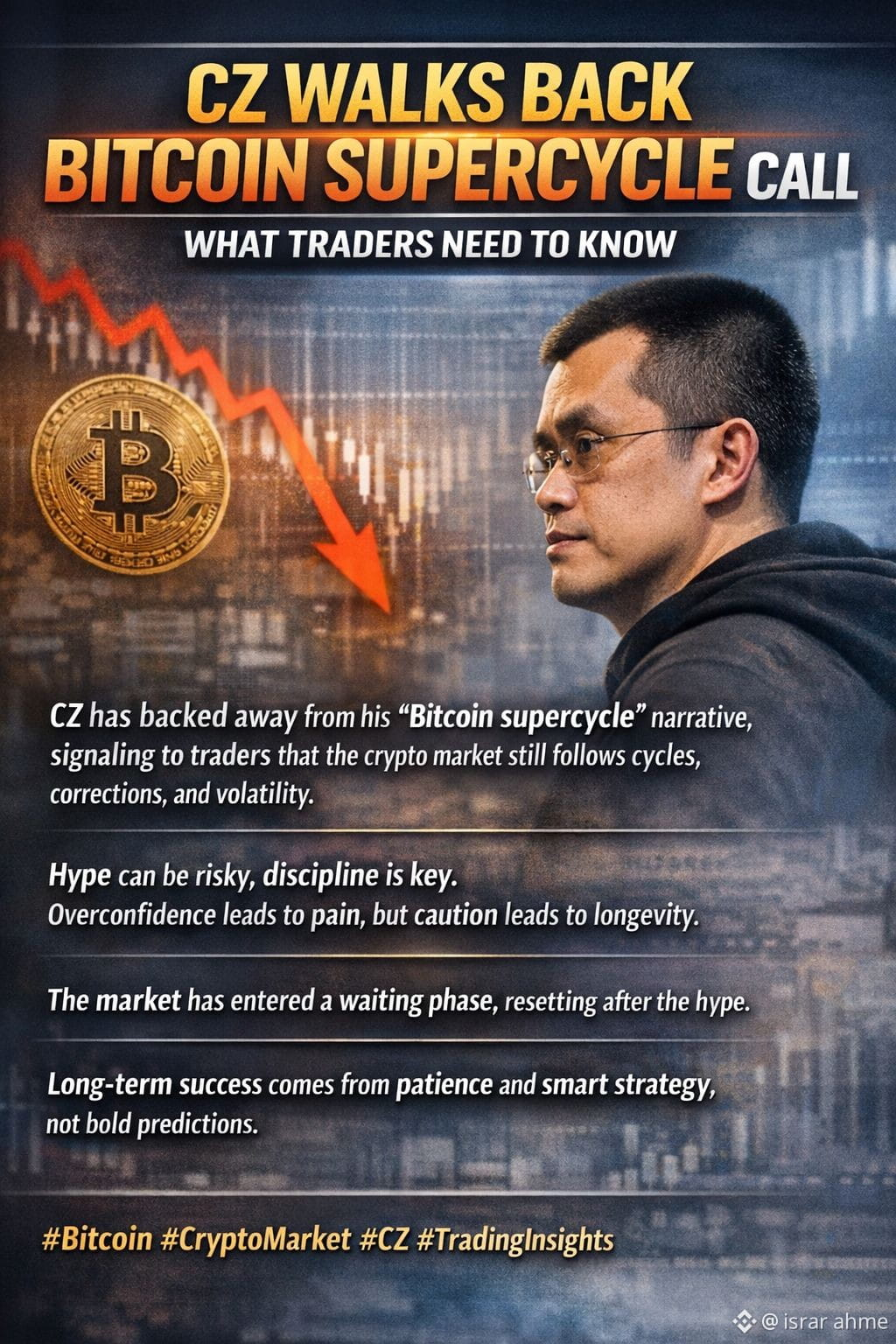 In the bigger picture, CZ walking back the supercycle narrative highlights the maturity of the crypto market. Bitcoin does not need unrealistic promises to succeed. Its strength lies in adoption, scarcity, and long-term demand. Traders who stay patient, flexible, and informed are more likely to survive and benefit, regardless of whether the next move is up or down.#KevinWarshNominationBullOrBear #DPWatch #USIranStandoff #GoldSilverRebound #VitalikSells