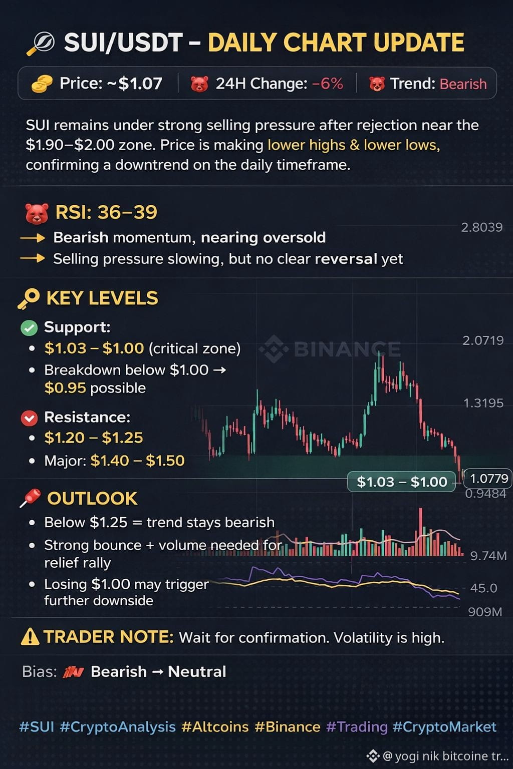 SUI is currently trading around $1.07, down nearly 6% on the day, reflecting continued bearish pressure across the market. On the daily timeframe, SUI remains in a clear downtrend, with price making lower highs and lower lows since the rejection near the $1.90–$2.00 zone.