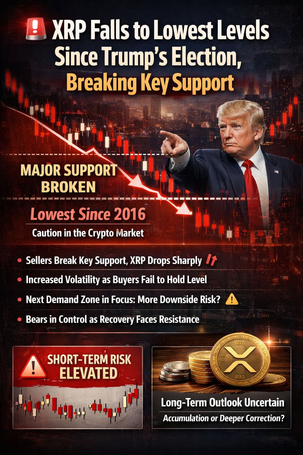 $XRP XRP has dropped to its lowest price level since the period around Donald Trump’s election sending a clear warning signal across the crypto market. The breakdown below a major support zone has shifted market sentiment from neutral to cautious, as sellers take short-term control.