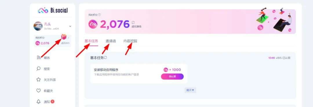 6. Ottieni 1.000 punti per il progetto SocialFi bi social Puoi ottenere punti verificando tweet, DC, scaricando APP, ID nuovi e invitando amici. Si può dire che sia un famoso airdrop di marca ed è relativamente popolare: