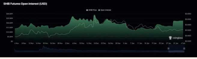 Secondo i dati di Coinglass, il Futures Open Interest della moneta è aumentato del 38% dal 29 gennaio. Al momento della stampa, l'Open Interest di SHIB ammontava a 22,06 milioni di $.