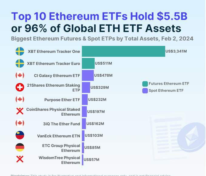 Mettendo ulteriormente in risalto gli ETF Ethereum, questo rapporto mette in luce XBT Ethereum Tracker One (COINETH), che si dice sia il re del mercato ETF globale con una dimensione di asset di 3,34 miliardi di $. Segue da vicino il suo concorrente, XBT Ethereum Tracker Euro (COINETHE), con un livello di asset totali pari a 510,93 milioni di $. Come primi ETF Ether al mondo a mettere piede su questo palco, hanno sicuramente segnato una pietra miliare in termini di esperienza dal loro lancio nell'ottobre 2017.