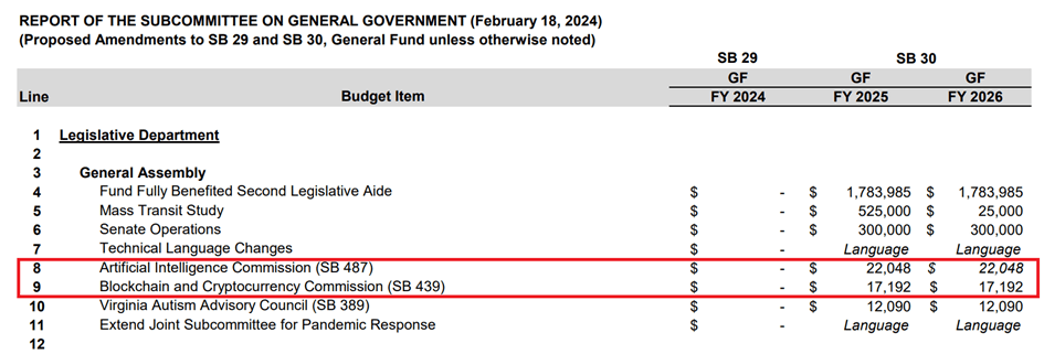 Lo Stato della Virginia propone la creazione di un fondo annuale pari a $ 39.000 per supportare le attività di due commissioni di nuova costituzione incentrate su criptovalute e intelligenza artificiale. Secondo questo piano, $ 22.048 saranno assegnati alla commissione per l'intelligenza artificiale e $ 17.192 alla commissione che si occupa di criptovalute.