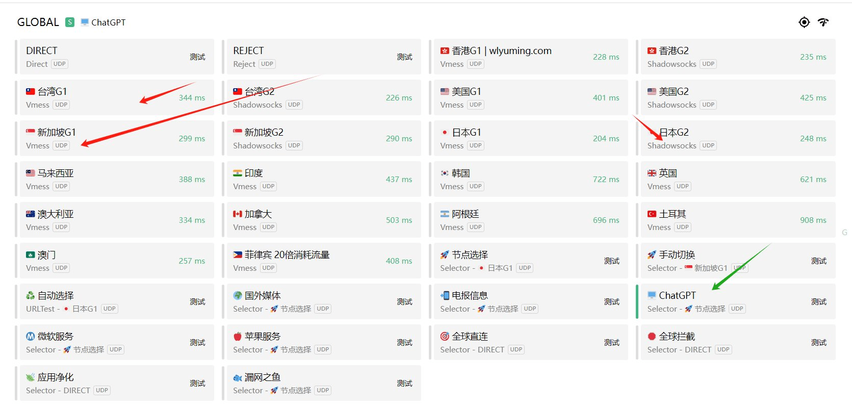 Inizialmente ho utilizzato il nodo del protocollo vmess indicato dalla freccia rossa nell'immagine seguente. Successivamente sono passato al nodo ottimizzato per servizi specifici indicati dalla freccia verde. Puoi provare a cambiare di più nodo o passare a una VPN migliore