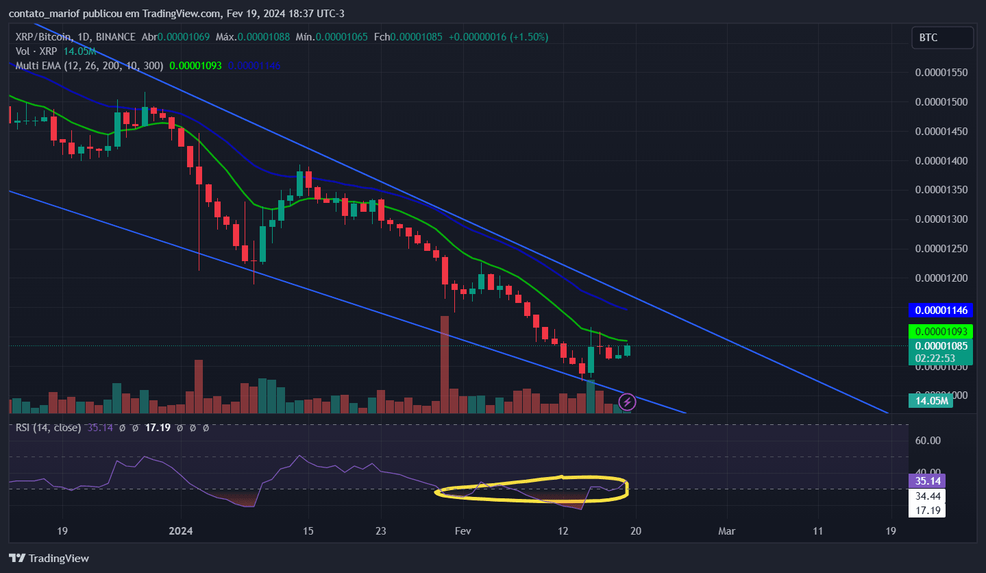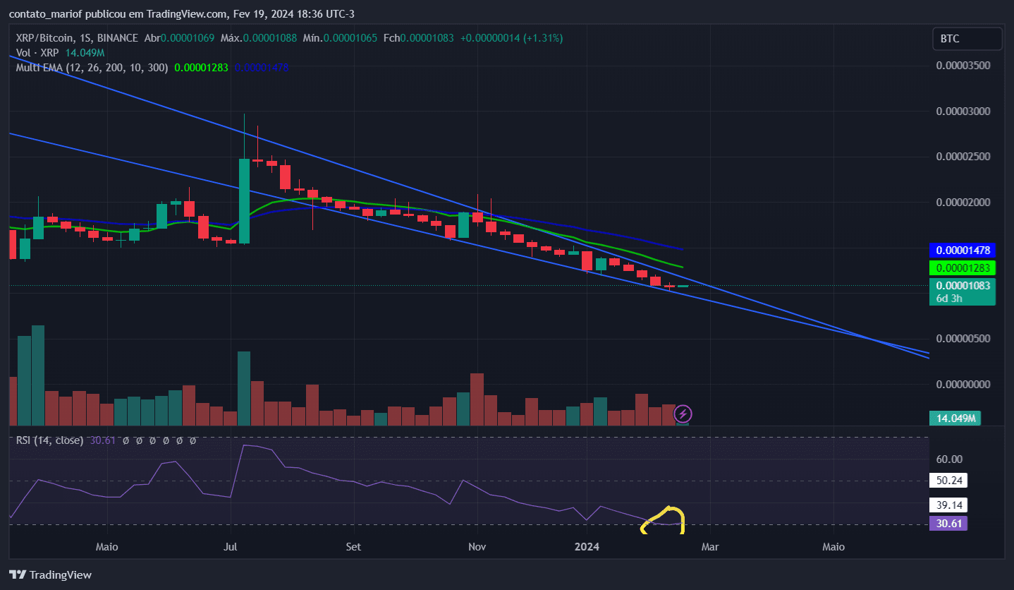 Analizzando la stessa coppia XRP/BTC, abbiamo osservato che sul grafico giornaliero, l'RSI ha raggiunto il livello di ipervenduto, indicando una possibile fine del trend al ribasso di questa coppia e suggerendo una possibile inversione di tendenza.