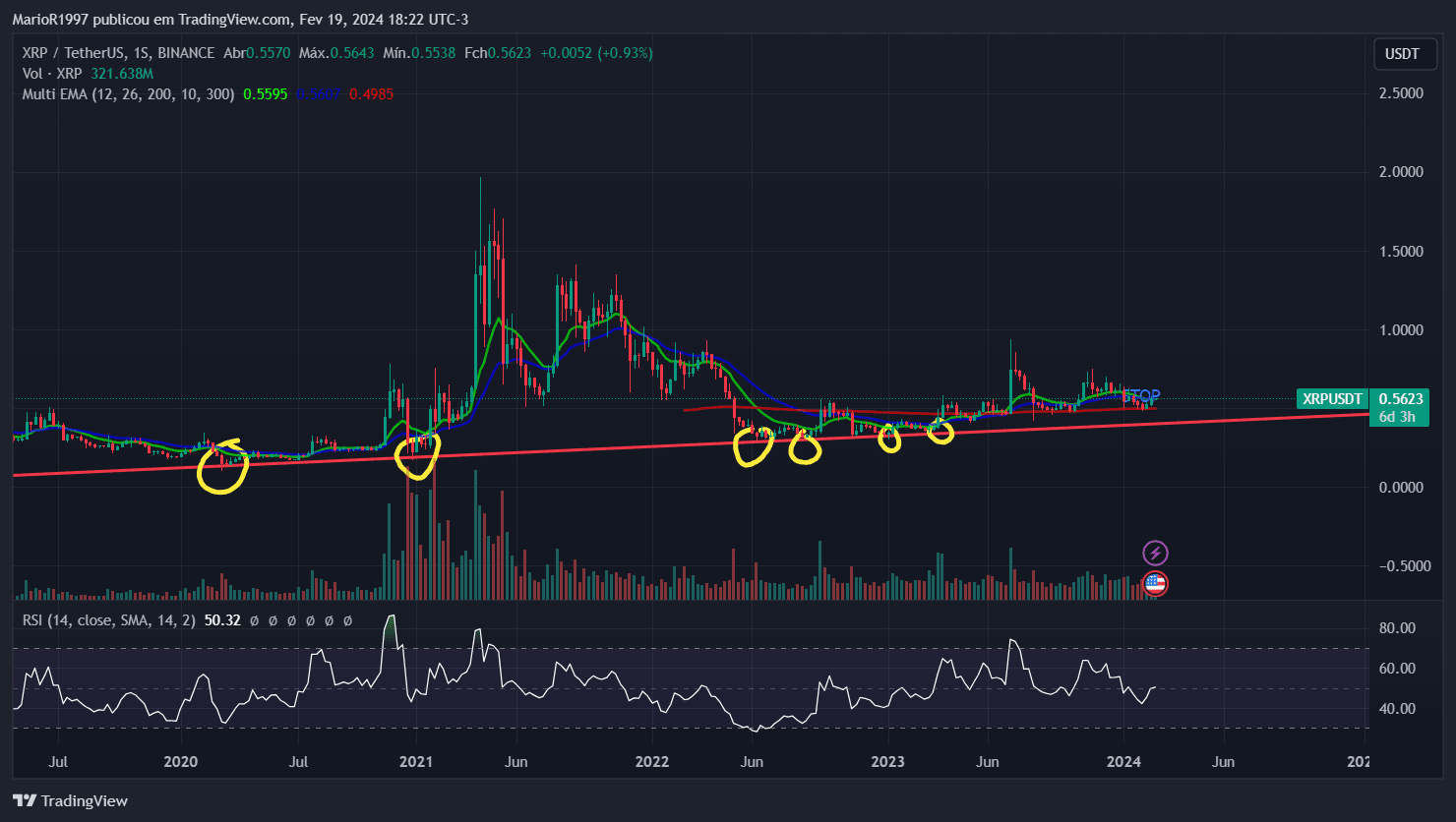 Sul grafico settimanale, c'è una linea di tendenza alta di tutti i tempi (LTA) che è stata rispettata nella storia del token XRP, indicando un solido supporto per l'asset.
