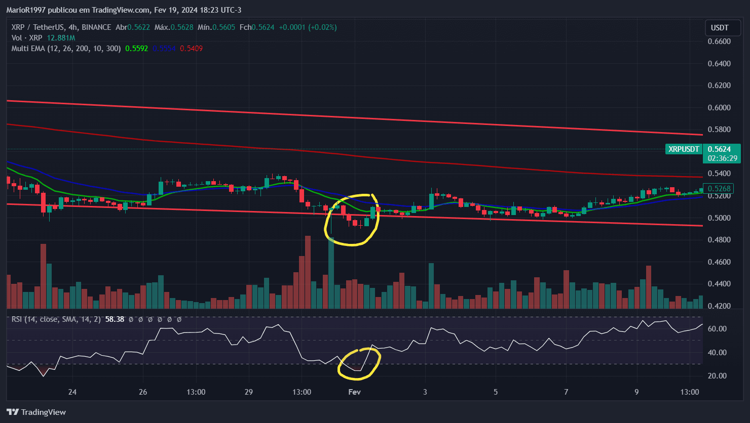 Sul grafico a quattro ore (4H) notiamo che alla fine di gennaio e all'inizio di febbraio l'RSI ha raggiunto il livello ipervenduto a causa della notizia di un attacco hacker alla società Ripple. Tuttavia, ciò non ha influenzato il modello del cuneo discendente mostrato sul grafico giornaliero.