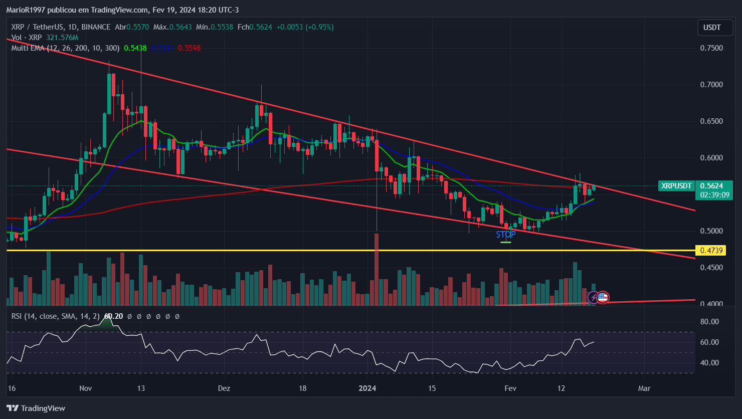 XRP è attualmente sull’orlo di un cuneo discendente, un modello che tende a sfociare in una rottura verso l’alto. Questo modello può essere identificato sul grafico giornaliero della coppia XRP/USDT. Inoltre, il Relative Strength Index (RSI) suggerisce un trend rialzista poiché è superiore al livello 50. Un altro indicatore favorevole è che il prezzo è superiore alle medie mobili a 12 e 26 periodi (rispettivamente linee blu e verdi), e attualmente sta superando la media mobile a 200 periodi (media rossa).