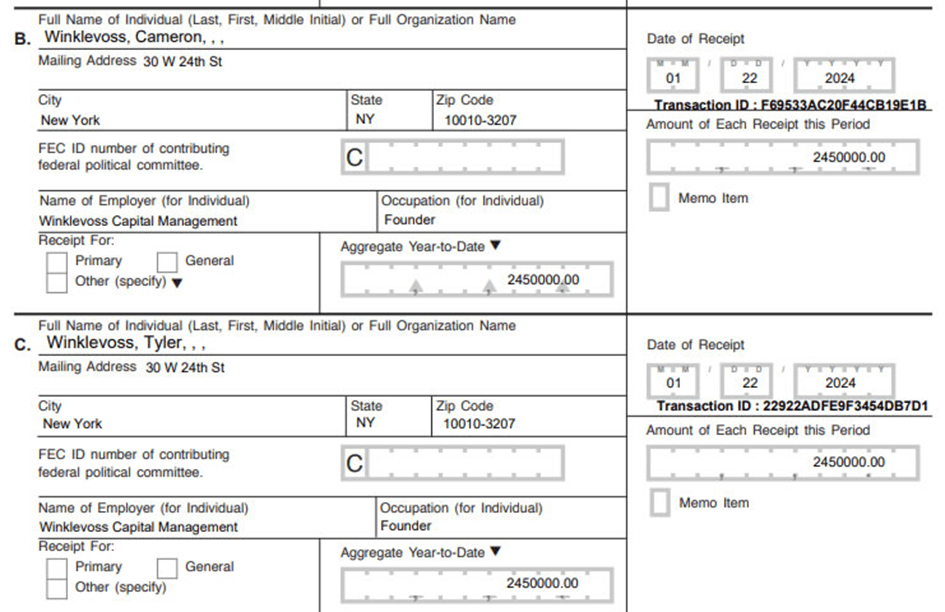 Secondo le informazioni della Commissione elettorale federale e i recenti documenti di Fairshake, i gemelli hanno donato metà della cifra indicata, pari a 2,45 milioni di dollari, a questa azione politica.